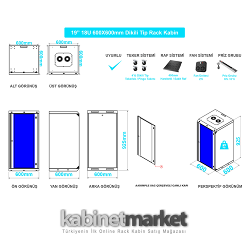 Dikili tip rack kabinetler, 4 adet ayarlanabilir cihaz dikmesi ile gelir ve ergonomik tasarımı sayesinde kullanım kolaylığı sağlar. 400-300mm derinliğindeki raf sistemleri ile uyumlu bu kabinetler, esnek bir kullanım imkanı sunarken, tavan kısmına opsiyonel olarak 2'li fan veya dikmelere ara modül fan eklenebilir, böylece ekipmanlarınızın soğutulması için ek seçenekler sunar. Pingo ve tekerlek takma imkanı ile de mobilite ve kolay yer değiştirme avantajı sağlar.